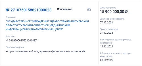 Предмет обоих контрактов: оказание услуг по сопровождению отдельных подсистем Региональной информационной системы здравоохранения Тульской области.