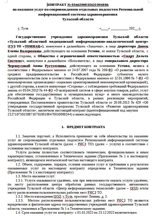 Эти контракты заключены между Государственным учреждением здравоохранения Тульской области «Тульский областной медицинский информационно-аналитический центр» (являющегося эксплуатантом РИСЗ) и… ООО «СМАРТ ДЕЛЬТА СИСТЕМС».