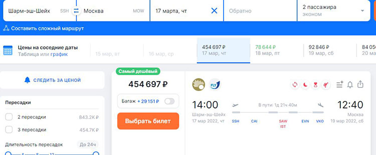 По данным на 17 марта, двое туристов могут улететь из Шарм-эш-Шейха без багажа до Москвы за 454 тысяч рублей. Лететь за эту стоимость туристам придется лететь почти двое суток.