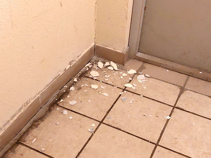 В подъезде — обшарпанные стены, разваливающиеся двери, неработающие лампочки и грязные полы с отлетевшей плиткой. Хотя сегодня появились уборщицы.
