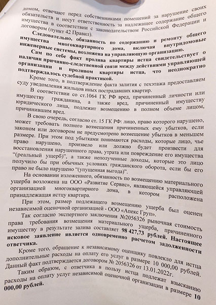 — Я шел с работы, мне дочь звонит, говорит, что по стенам, обоям течет вода, а живем мы на 15 этаже. На сегодня уже все подсохло, но видно, что частично отвалились обои, вздулись полы. Мы проводили независимую экспертизу, согласно которой, причиненный материальный ущерб составляет 98 тысяч 427 рублей. Из УК на экспертизе никто не присутствовал, хотя я писал им заказные письма с уведомлениями, мне даже не ответили. Потом я пришел к ним с результатами независимой экспертизы, мне не ответили, будут ли они что-то решать. Потом я подал уже в суд (где-то 2 недели назад). Пока идет суд, ремонт я делать не буду, — сообщил Сергей.