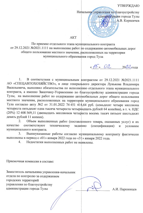 В системе Госзакупок появилась интересная информация о принятии к оплате городским бюджетом Тулы работ выполненных уже ликвидированным АО «Спецавтохозяйство» на 737 миллионов 708 тысяч 855 рублей, 28 копеек.
