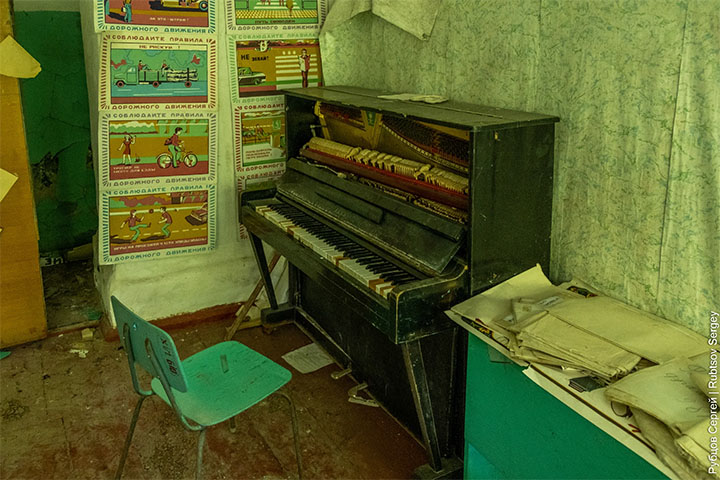 За одной из первых дверей мы натыкаемся на изюминку данного места — брошенное пианино.