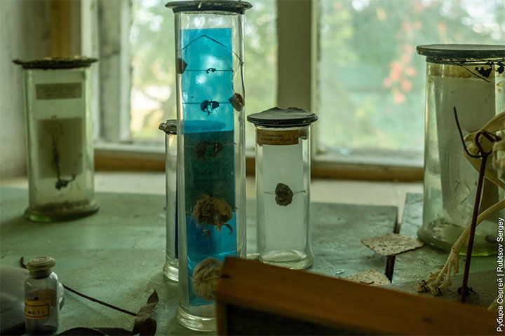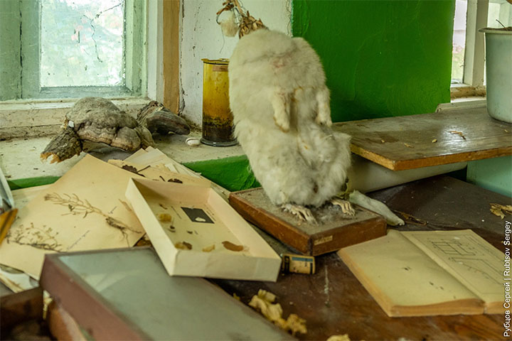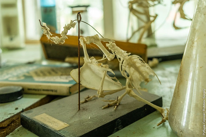 За дверью в кабинет биологии нас ждут самые интересные из сохранившихся тут экспонатов, видимо, дома никому не нужны скелеты животных.