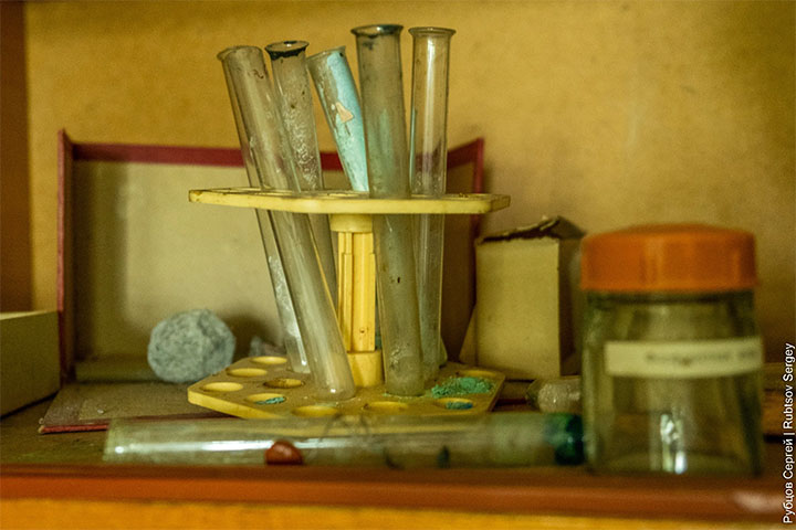Внутри это ощущение лишь усиливается, благодаря хаосу и предметам, которые вываливаются из ярких шкафов. Тут мы видим остатки микроскопов, какие-то физические приблуды и гипсовые формы для рисования.