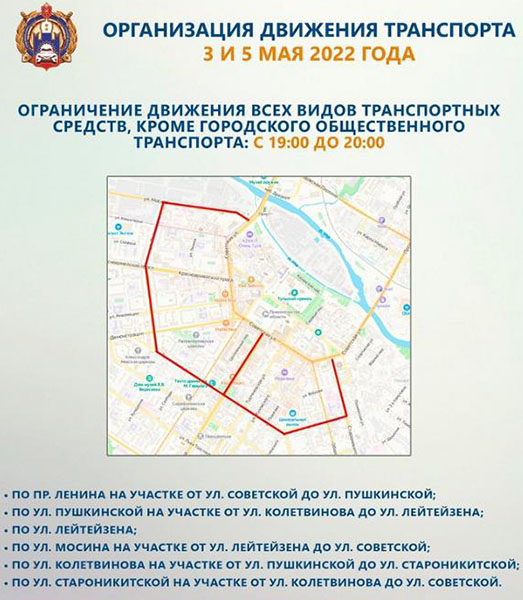 3 и 5 мая с 19.00 до 20.00 ограничат движение всех видов транспортных средств, кроме городского общественного транспорта: