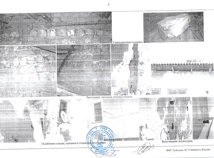 Главными недостатками и повреждениями эксперт называет вертикальные, диагональные и горизонтальные трещины кладки, несущих конструкций. Кроме того, говорится об ослаблении кирпичной кладки в подвале, прогибе стропильной системы, трещинах стропильных ног на чердаке.