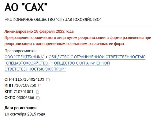 Как выяснилось, еще в ноябре 2021 года, решением акционеров АО «САХ» разделилось на ООО «Спецтехника», ООО «САХ», ООО «Экопром». В дальнейшем ООО «Спецтехника» слилось с ООО «Сфера», ООО «Союз-Л» и ОАО «Тульская мусорная компания». И уже в феврале 2022 года АО «САХ» сняли с учета, вместо него были образованы новые организации: ООО «Спецтехника», ООО «САХ» и ООО «Экопром».