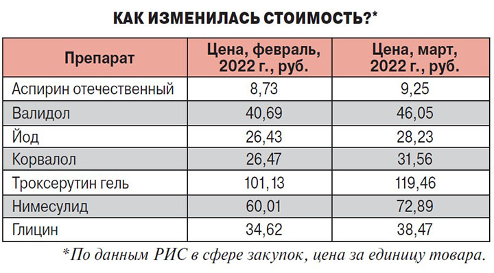 Порошок «Смекта», 10 пакетов в феврале стоили 69,39, а в марте цена выросла почти в три раза – до 156,36 руб. Более чем на 30% увеличилась стоимость мази «Левомеколь», в феврале цена была 165,37 руб. и уже 215,88 руб. – в марте. Кстати, по отношению к марту 2021 года цена выросла на 43%. Комбинированные анальгетики, 10 таблеток — подорожали на 21,4 руб., а в сравнении с прошлым мартом – на 24%. Более чем на 20% также подорожали суспензия от изжоги «Алмагель». «Корвалол» подорожал на 19,23%.