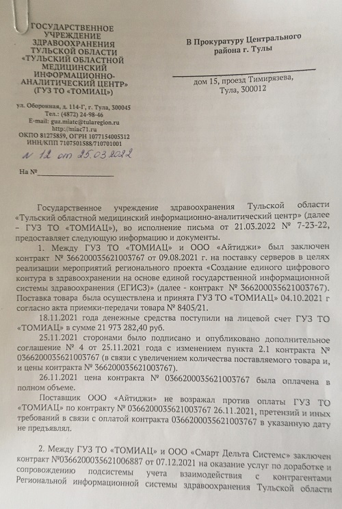 Так же мы сообщали, что между ГУЗ Тульской области «Тульский областной медицинский информационно-аналитический центр» (являющегося эксплуатантом РИСЗ) и разработчиком этой системы ООО «Смарт Дельта Системс» в конце 2021 года были заключены новые контракты.