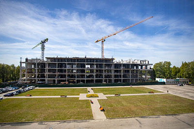 Рабочие возвели почти пять этажей десятиэтажного здания на площади Искусств в Туле, где расположится первый в регионе аквапарк.