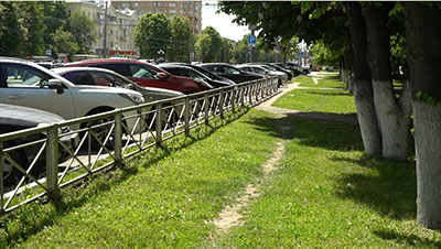 А вот парковка уже на перекрестке проспекта Ленина и улицы Агеева, но ситуация та же самая: чтобы покинуть парковочный карман, нужно либо выйти на одну из самых оживленных магистралей города, либо проявить чудеса растяжки и перешагнуть через преграду.