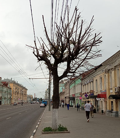 Почти засохло единственное дерево в самом начале проспекта Ленина в Туле.