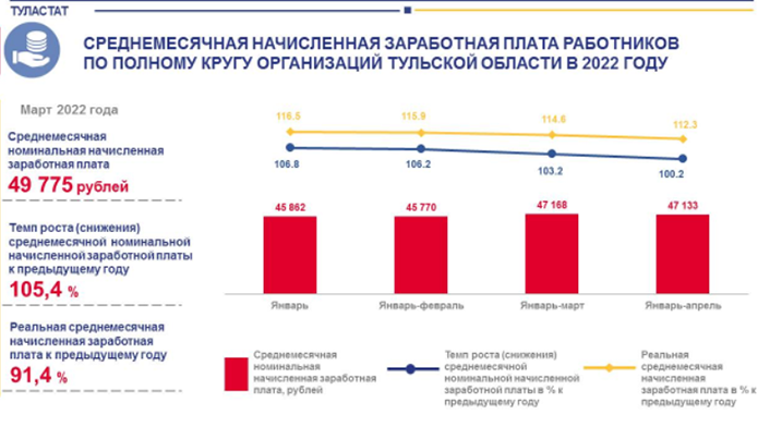 Туластат опубликовал данные по зарплатам за январь-апрель этого года и сравнил их с аналогичными цифрами прошлого.