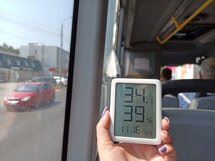 Недавняя передышка с дождями длилась недолго. Синоптики нам обещают возвращение аномальной жары уже в понедельник, 11 июля. В этот день столбик термометра поднимется до 31 градуса. Хотя со вторника, 12 июля, нам снова предсказывают похолодание. Но впереди еще половина лета. Поэтому мы решили проверить, насколько комфортно в жару передвигаться на городском общественном транспорте. Для этого мы вооружились электронным термометром, который предварительно сверили с его аналоговыми ртутными вариантами и другим его цифровым собратом, и проехались в троллейбусе, маршрутке, автобусах и трамвае. Эксперимент проводился 7 июля, когда на улице стояла 31-градусная жара. Время поездки в каждом виде транспорта – около 15 минут.