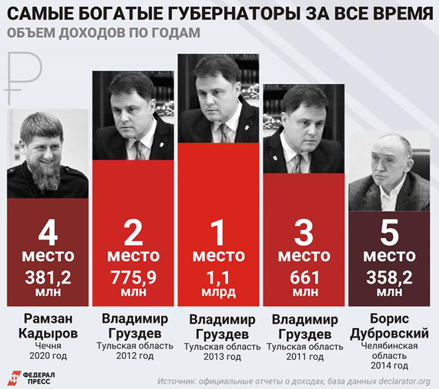 Самый большой доход за всю историю декларирования, то есть с 2009 года, получил в 2013 году губернатор Тульской области Владимир Груздев – почти 1,1 миллиарда рублей. Он же занял второе место с показателем 775,9 миллиона рублей в 2012 году и третье – почти 661 миллион в 2011 году. За ним следует чеченский лидер Рамзан Кадыров, заработавший в 2020 году 381,2 миллиона рублей, а замыкает пятерку челябинский губернатор Борис Дубровский с доходом 358,2 миллиона рублей за 2014 год.