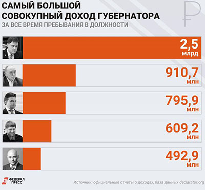 Суммарно за все годы пребывания в должности главы региона заработал вышеупомянутый Владимир Груздев – 2,5 миллиарда рублей, за ним – Борис Дубровский (910,7 миллиона). «Бронзу» по уровню совокупных доходов заслужил подмосковный губернатор Андрей Воробьев с 795,9 миллиона рублей. Хороший уровень жизни продемонстрировали Рамзан Кадыров (609,2 миллиона рублей) и липецкий губернатор Игорь Артамонов (492,9 миллиона рублей).