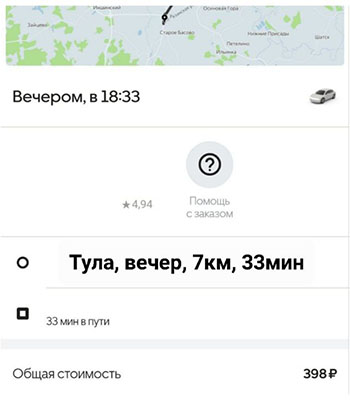 Вот личный пример, поездка в Туле в вечернее время, 7 км пути, 30 минут дороги, стоимость 400 рублей. Примерно в это же время, тоже 7 км, 20-минутная поездка на такси в Москве стоила 350 рублей.