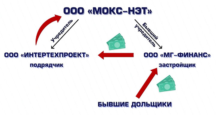 По документам, среди компаний-кредиторов фигурирует и подрядчик ООО «Интертехпроект», который в своё время с опозданием зашёл на объект. Но это ещё не самое удивительное. По данным сервисов налоговой службы, у этого подрядчика и застройщика «МГ Финанс» за 2 недели до банкротства был один и тот же учредитель – фирма «Мокс-Нэт». Получается, теперь она как бы задолжала сама себе. А на обеспечение этого долга могут пойти компенсации застройщика бывшим дольщикам. Потому что в конкурсной очереди – опять же по закону о банкротстве – долги по контрактам и сделкам имеют приоритет.