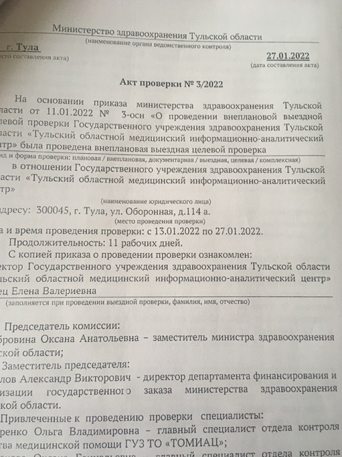 В ходе контрольного мероприятия Наши читатели информируют об итогах деятельности гражданки Донец на посту руководителя ГУЗ ТО «Тульский областной медицинский информационно-аналитический центр»