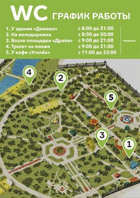 Туалеты также есть в Комсомольском и Пролетарском парках и в парке Патриот. Работают они также с 9:00 до 21:00. Бумага и мыло есть.