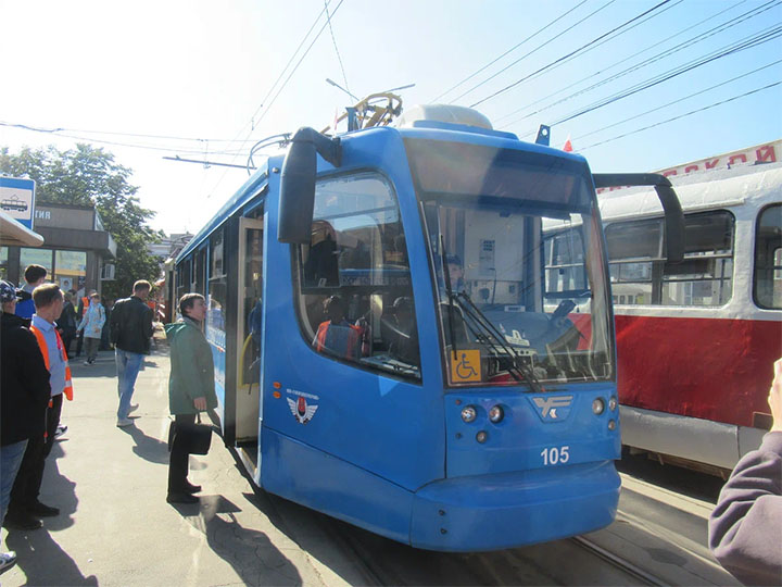 Трамвайный вагон модели 71-623-02 номер 105, ближайшее будущее тульского трамвая, 10 вагонов данного типа физически уже находится в депо, но бюрократия стоит на пути их выпуска на линию, не готовы документы.