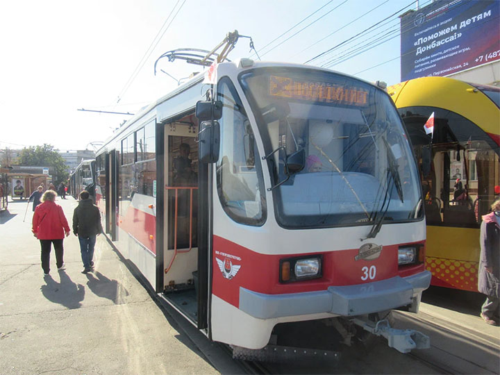 Трамвайный вагон модели 71-407 номер 30. Конкретно данный экземпляр был приобретен в этом году по остаточной стоимости в Таганроге. Всего было закуплено в Таганроге 3 таких трамвая. вкупе с 14 вагонами, приобретенными с завода в 2013 году, в городе имеется 17 вагонов модели 71-407.