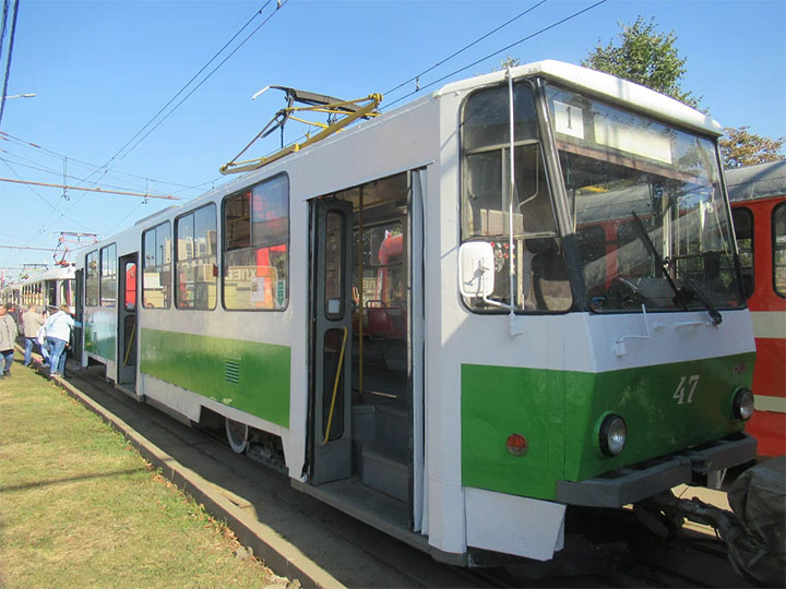 Трамвайные вагоны Т-6В5 номер 332 и 47. Вагон номер 332 получил окраску, максимально близкую к заводской, даже серые прямоугольники над дверями были нанесены, чего уже не наблюдалось десятки лет, с начала 90-х, когда трамваи были перекрашены. Трамвай номер 47 получил зелено-белую окраску, именно в такой он поступил в 1996 году с завода. Вагоны были сцеплены во временную систему 332-47.