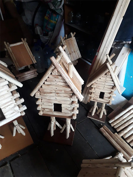 Обычный, скромный человек по имени Юрий, с небольшой пенсией по инвалидности, который попросил меня его не фотографировать. Это он сидит целый день в гараже и стругает обычным ножом заготовки (опиленное дерево орешника, осины, собранное вдоль дорог), а потом при помощи саморезов собирает их в симпатичные домики.
