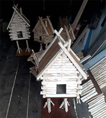 Обычный, скромный человек по имени Юрий, с небольшой пенсией по инвалидности, который попросил меня его не фотографировать. Это он сидит целый день в гараже и стругает обычным ножом заготовки (опиленное дерево орешника, осины, собранное вдоль дорог), а потом при помощи саморезов собирает их в симпатичные домики.