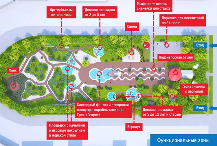 Согласно новой концепции, в сквере появится несколько зон: тишины, спортивно-игровая, смотровая площадка, сцена и парковка. Планируется провести дополнительное озеленение, отремонтировать стационарный туалет, установить каскадный фонтан, заменить дорожное покрытие, скамейки, светильники, урны. Новое художественное оформление получит водонапорная башня.