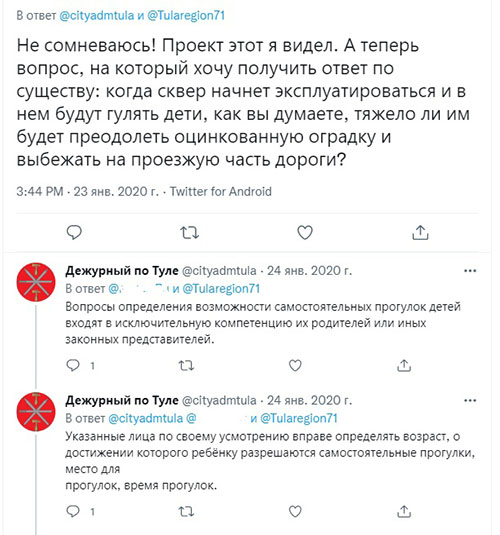 Но позвольте, господа благоустроители, не далее как три года назад проект уже был разработан компанией, которая до этого проектировала пожарные депо. Первая часть этого проекта была успешно реализована. Мы с теплотой в сердце вспоминаем синего кита погибшего в неравной схватке с тульской действительностью. Маяк же стоит до сих пор! Так же в памяти остался демонтаж высокого красивого железного забора (наверно кто-то сдал много лома) и установка оцинкованных оградок. Понимаете стратегический замысел? Детский сквер окружен со всех сторон автодорогой и старый забор был непреодолимым препятствием на пути маленьких детей. И вдруг его заменяют на оградки в которые как раз ребенок прекрасно пролезает. (ниже эпическая переписка с администрацией в твиттере по этому поводу). А в новом проекте на рендерах опять присутствует старый высокий забор! Круг замкнулся.