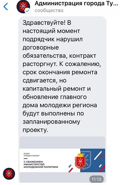 По информации Министерства молодежной политики Тульской области, в связи с невыполнением обязательств по ремонту здания Тульского областного центра молодёжи контракт с подрядчиком расторгнут. В текущем году новый подрядчик приступит к работам. Завершить их планируется в декабре 2023 года.