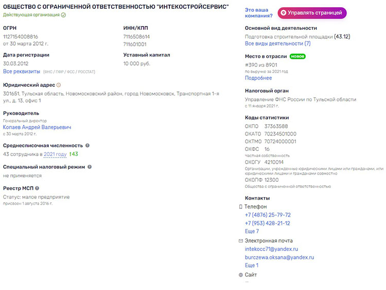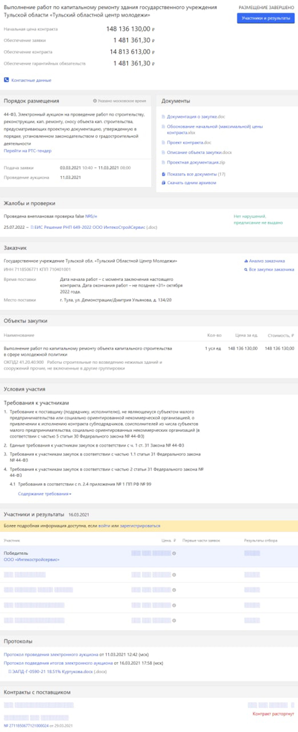 И мы нашли этого подрядчика на сайте госзакупок: именно ООО «Интекостройсервис» и стало победителем на выполнение работ по капитальному ремонту здания госучреждения «Тульский областной центр молодежи».