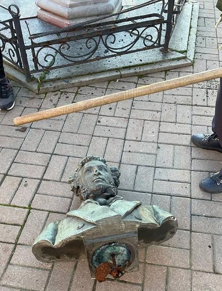 В Киеве снесли бюст Александра Пушкина, установленного перед входом в здание Национального транспортного университета. Этот памятник — близнец тульского Пушкина, который стоит в Пушкинском саду. Они оба были изготовлены скульптором Р. Бахом на петербургской фирме Берто в 1899 году, в честь столетия великого русского поэта.