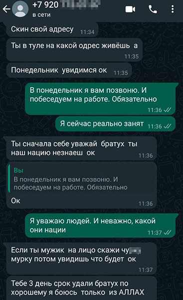 Неизвестный делал еще несколько попыток дозвониться, после чего корреспондент внес его в ЧС. Тогда звонивший перешел на звонки и СМС в WhatsApp, отправлял угрозы, но был заблокирован и там.