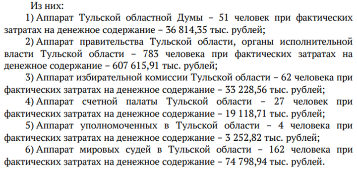 При этом численность работников государственных учреждений Тульской области составила 52 062 человека, на их содержание ушли 9 351 907 590 рублей. В эту сумму не входит зарплата и обязательное медицинское страхование.