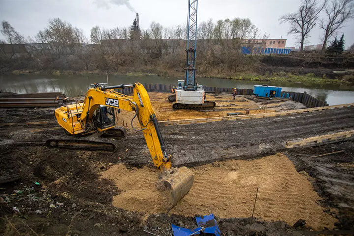 В настоящее время возведен временные пешеходный и понтонный мосты, которые позволяют работать на правом и левом берегах. Специалисты собирают конструкции, которые в будущем будут служить опорой путепровода. Также, чтобы впоследствии установить колонну, рабочим пришлось сузить русло реки.