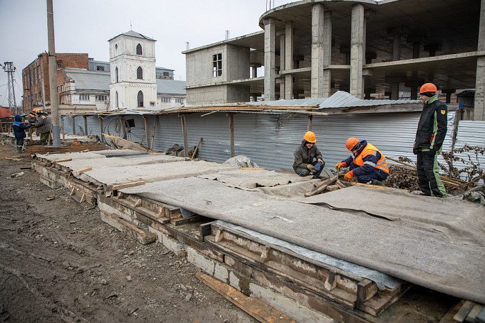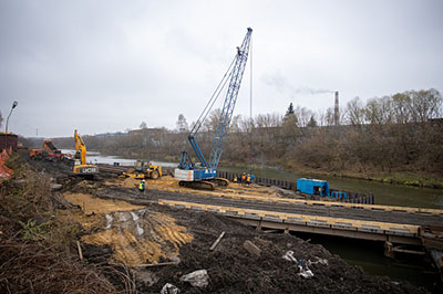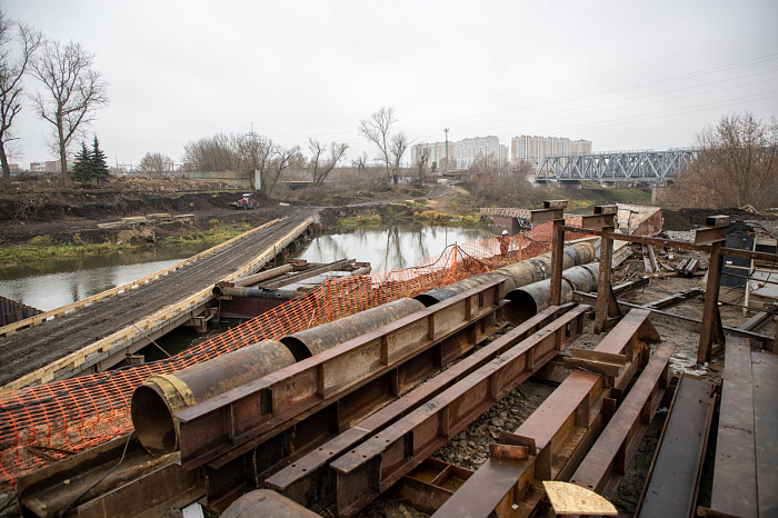 В настоящее время возведен временные пешеходный и понтонный мосты, которые позволяют работать на правом и левом берегах. Специалисты собирают конструкции, которые в будущем будут служить опорой путепровода. Также, чтобы впоследствии установить колонну, рабочим пришлось сузить русло реки.