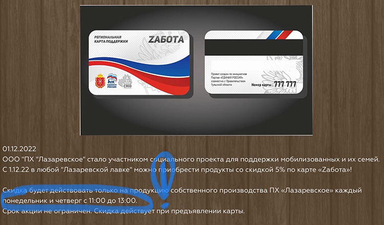 Вот, например, в Туле по инициативе губернатора Алексея Дюмина ввели вариант известной карты Забота для семей мобилизованных — Zабота. По этой карте они могут получить скидки у многих бизнесменов региона — в магазинах, аптеках, на товары и услуги.