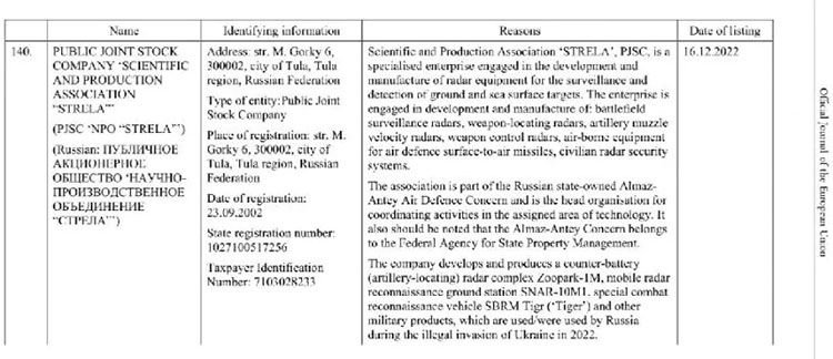 Среди 168 российских предприятий оборонно-промышленной отрасли, которые внесены в список, оказались завод «Тула» и «НПО Стрела».