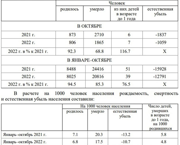 Также сообщается, что число умерших в январе–октябре 2022 года превысило число родившихся в 2.6 раза (в прошлом году этот показатель составлял 2.9).