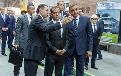 Евгений Зубицкий сопровождает на территории «Тула-Стали» Дмитрия Медведева и Алексея Дюмина. Фото: tularegion.ru