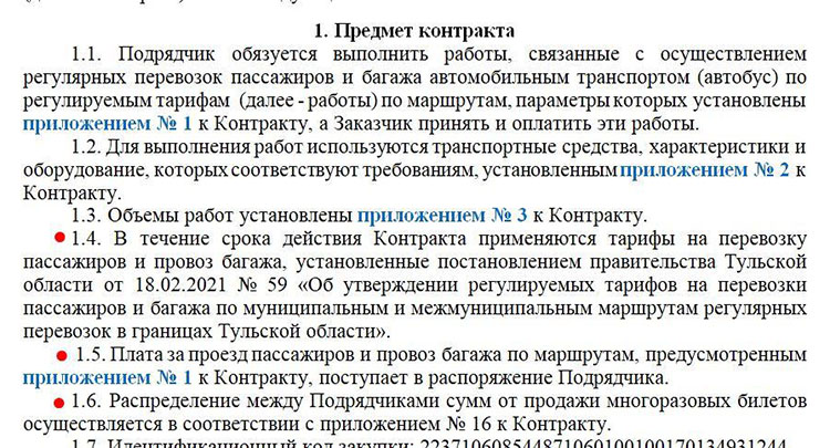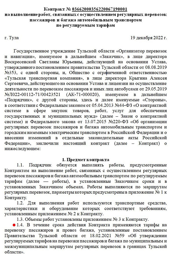«1.4. В течение срока действия Контракта применяются тарифы на перевозку пассажиров и провоз багажа, установленные постановлением Правительства Тульской области от 18.02.2021 №59 «Об утверждении регулируемых тарифов на перевозки пассажиров и багажа по муниципальным и межмуниципальным маршрутам регулярных перевозок в границах Тульской области».