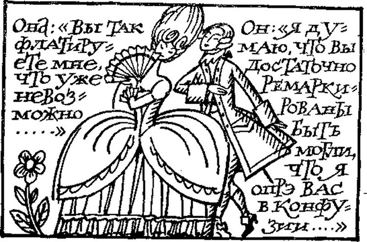 Существует байка: фразу «Франт идет из цирка в театр по бульвару в галошах и с зонтиком» перевели на «патриотический» (авторство приписывают Белинскому). Получилось: «Хорошилище грядет из ристалища на позорище по гульбищу в мокроступах и с растопыркой».