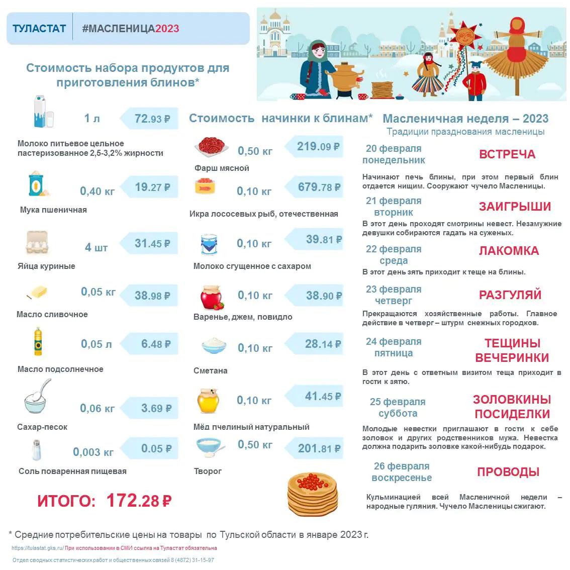 В целом блины на Масленицу в 2023 году обойдутся в 172 рубля 28 копеек. Эксперты взяли рецепт блинов и высчитали цену для каждого ингредиента.