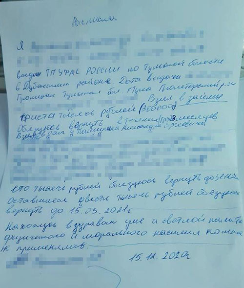«Было какое-то нервное напряжение. Нам хотелось поскорее расплатиться и забыть это, просто как страшный сон. Предложили встретиться на следующий день, но Никитин сказал, что тогда деньги придется отдавать ему, так как завтра Пашинин не может. Мы на такой вариант не согласились. Договорились, что Пашинин напишет расписку о получении денег, в которой укажет, что больше не имеет к нам претензий, а расписка от 15 декабря теперь недействительна. Знакомый юрист сказал нам, что так можно», — вспоминает Екатерина.