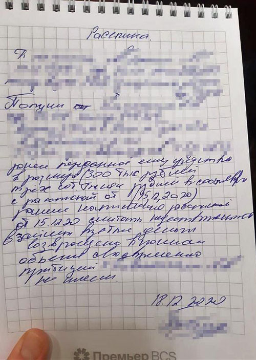 Из-за этого супруги не только не стали фотографировать место происшествия, но и согласились написать расписку, в которой говорилось, что Александр взял у собственника внедорожника в долг 300 тысяч рублей и обязуется их вернуть к условленному сроку. Важно — на тот момент собственником Range Rover был некий Пашинин, на его фамилию расписку и составляли.