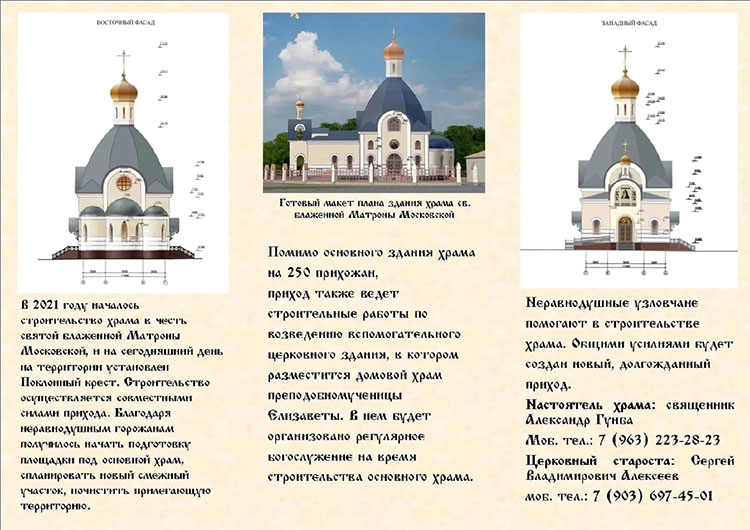«Приход храма святой блаженной Матроны Московской зарегистрировали в январе 2022 года. Местный благотворительный фонд взял обязательства построить храм, и Митрополит Алексий благословил дело. Был создан и одобрен проект, начались работы по подготовке площадки и подведению коммуникаций. Но в апреле прошлого года фонд пропал — приход остался без финансирования», — объяснил настоятель.