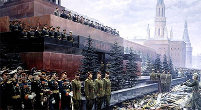 То есть отменённый в 1991-м парад вернули – но без военной техники. А поскольку просто вооружённые русские – это тоже агрессивно, то над Красной площадью повесили гигантский плакат, на котором советский солдат- победитель льнёт к американскому союзнику.